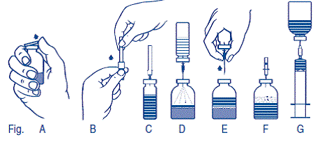 2.Retirer les capuchons protecteurs des flacons contenant la poudre et le solvant (fig. A) et désinfecter les bouchons en caoutchouc des deux flacons.