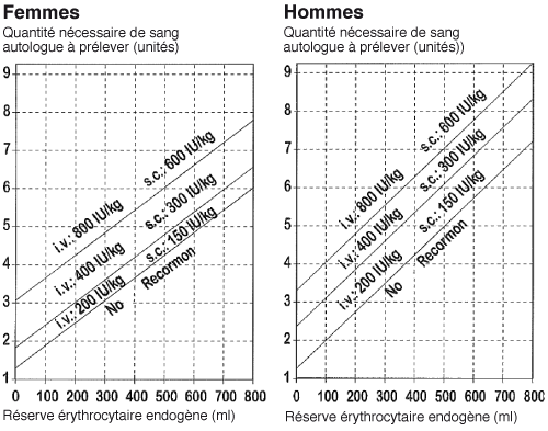 Les nomogrammes suivants permettent de décider si un traitement par une formulation de Recormon est nécessaire et, si oui, de déterminer la dose unitaire, sur la base du volume de sang autologue à prélever et de la réserve érythrocytaire endogène.