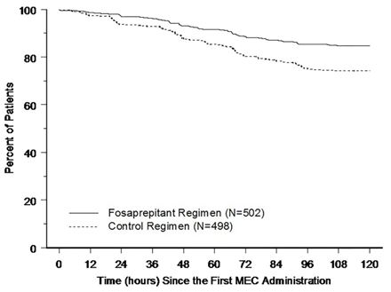 Les courbes de Kaplan-Meier de la Figure 1 montrent que le délai avant le premier vomissement était plus long avec le régime avec fosaprépitant qu'avec le régime de contrôle (valeur nominale de p <0,001 avec le test de log-rank).