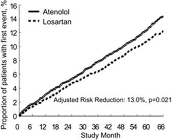 Le critère d'évaluation principal était la combinaison des cas de morbidité et de mortalité cardiovasculaires et il était mesuré en termes de réduction des événements cardiovasculaires combinés de décès cardiovasculaire, d'accident vasculaire cérébral et d'infarctus du myocarde. Les résultats ont montré que le traitement par le losartan a permis, par rapport à l'aténolol, une réduction du risque de 13% (p=0,021) pour le critère d'évaluation principal combiné (voir le graphique 1).