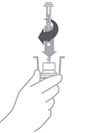 (f) Poser le flacon de suspension reconstituée sur une surface dure et tenir en place. Fixer l'ensemble adaptateur-seringue au flacon en tenant la partie extérieure de l'adaptateur et en poussant fermement la pointe de l'adaptateur dans le bouchon en caoutchouc, jusqu'à ce qu'un clic indique que le raccord est bien en place.