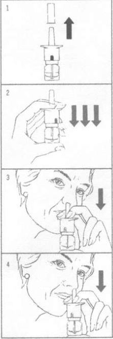 4.Après l’utilisation, respirer plusieurs fois énergiquement par le nez afin d’éviter que la solution ne s’écoule du nez. Ne pas se moucher le nez immédiatement après l’utilisation.