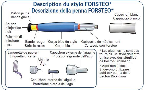 Pour de plus amples informations sur le stylo FORSTEO et son utilisation, veuillez vous adresser à votre médecin, à votre pharmacien ou à votre personnel soignant.