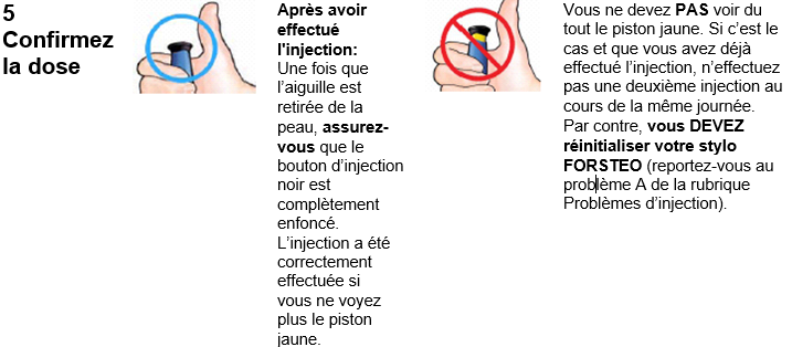 Le stylo FORSTEO permet d’injecter une dose complète à chaque utilisation effectuée conformément aux indications de la rubrique Instructions pour l’utilisation. Lorsque le bouton d’injection noir est complètement enfoncé, cela indique que la dose complète du stylo FORSTEO a été injectée. Souvenez-vous qu’il faut utiliser une nouvelle aiguille à chaque injection pour être sûr que votre stylo FORSTEO fonctionne correctement.