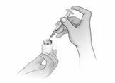 1.Retirez le capuchon protecteur du flacon (A). Veillez à ne pas toucher le bouchon en caoutchouc du flacon. Nettoyez le bouchon avec une compresse alcoolisée (E). 2.Retirez la feuille adhésive de l’emballage contenant la seringue (B) et l’aiguille de prélèvement (C) (la plus grande). Placez l’aiguille sur la seringue.