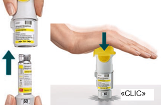 Si la base transparente a déjà été tournée, suivez les étapes «OUVRIR» et «DÉCLENCHER» décrites à la section «Utilisation quotidienne» pour administrer le médicament.