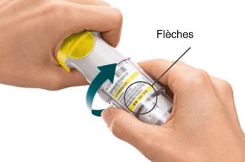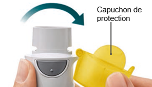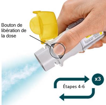 DÉCLENCHER ·Expirez lentement et profondément. ·Refermez les lèvres sur l’embout buccal sans recouvrir la prise d’air. Tenez l’inhalateur horizontalement en direction de la gorge. ·Inspirez lentement et profondément par la bouche. APPUYEZ en même temps sur le bouton de libération de la dose de l’inhalateur tout en continuant à inspirer lentement tant que ce n’est pas désagréable. ·Répéter les étapes TOURNER, OUVRIR et DÉCLENCHER pour inhaler la deuxième bouffée. ·Refermez le capuchon de protection jusqu’à la prochaine utilisation de l’inhalateur.