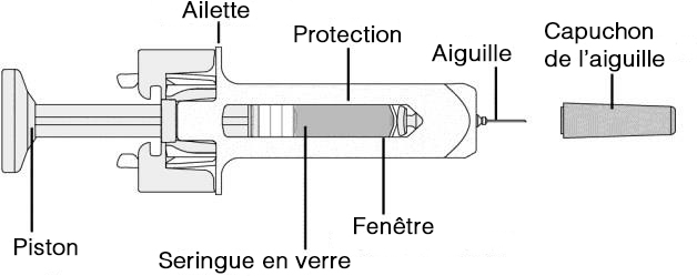 Mise en garde/précaution : NE PAS tordre le capuchon de l’aiguille ni toucher l’aiguille ou le piston. Retirez le capuchon de l’aiguille en le tirant dans l’axe, comme indiqué, et manipulez la protection de manière à éviter de vous piquer ou de courber l’aiguille.