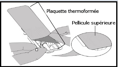 Mise en garde/précaution : vérifiez que l’intérieur de la boîte ne contient pas de fragments ou de liquide. Dans le doute, N’OUVREZ PAS cette boîte et prenez une autre boîte Ouvrez la plaquette thermoformée en détachant complètement la pellicule supérieure, comme illustré.