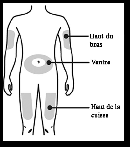 Ne pas injecter dans des zones où la peau est sensible, contusionnée, rouge ou dure. Évitez de pratiquer l’injection dans des zones présentant des cicatrices ou des vergetures.