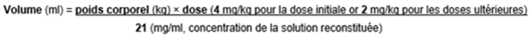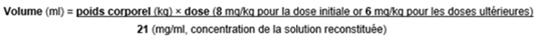 Le volume de solution reconstituée nécessaire au traitement du patient concerné est déterminé de la façon suivante: