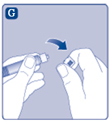 ·Retirez le capuchon de la seringue préremplie en l’inclinant vers le bas jusqu’à ce que la perforation cède. Ne touchez pas l’extrémité de la seringue sous le capuchon de la seringue. Si vous touchez l’extrémité de la seringue, vous risquez de transférer des germes de vos doigts. Si le capuchon de la seringue est défait ou manquant, n’utilisez pas la seringue préremplie.