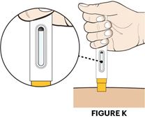 ·Étirez la peau et placez le stylo prérempli droit sur le site d’injection nettoyé, avec le protège aiguille jaune à plat sur la peau (voir Figure K).